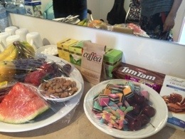 楽屋のフルーツやチョコ!!物販コーナー盛況でした! |